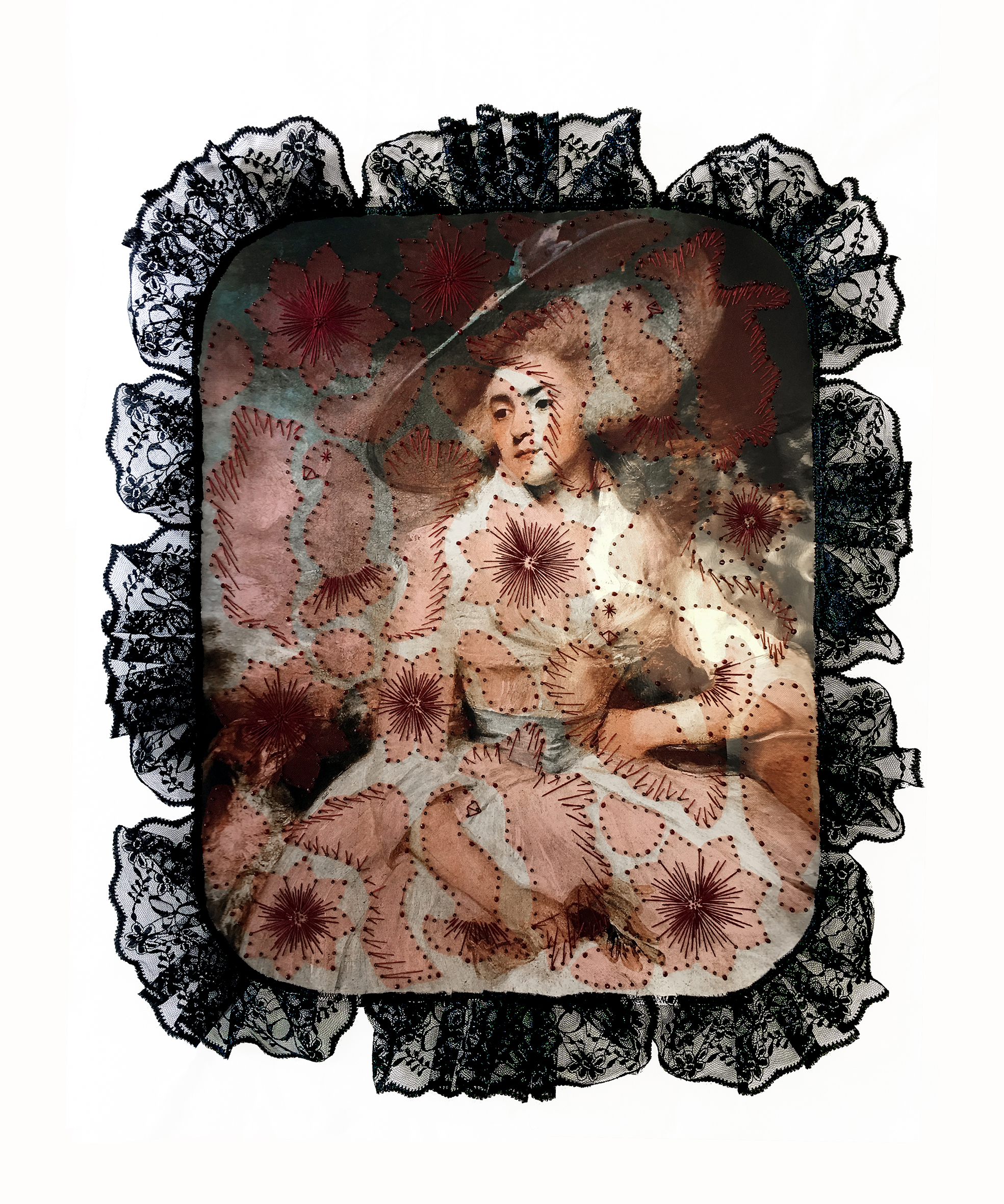 Family Portraits III, 2021. Estampado en papel perlado, intervenido con tul, abalorios y bordado. Marco de encaje. 87 x 72 x 3 cm.