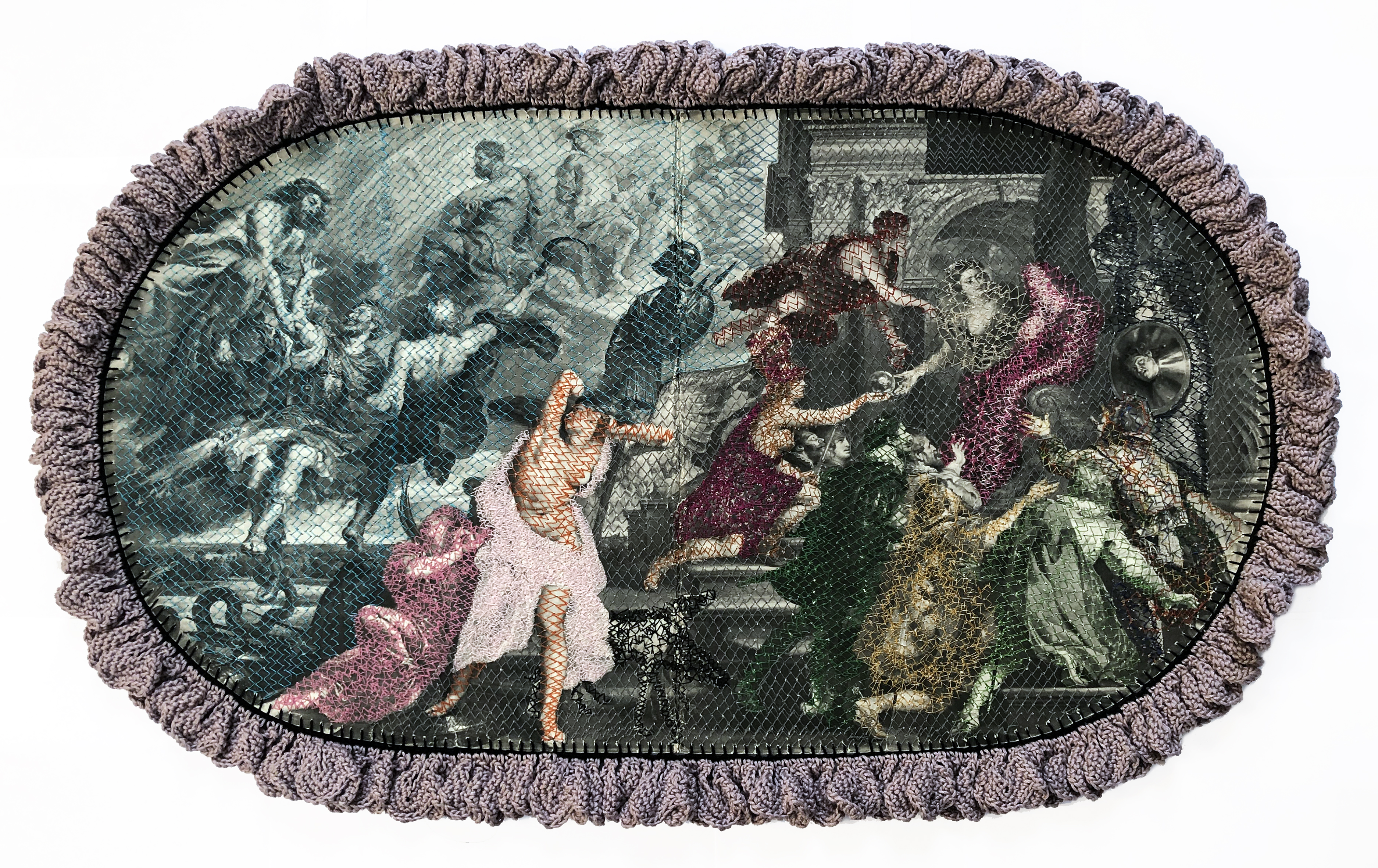 Family Portraits I, 2021. Páginas de libros de historia del arte intervenidas con bordado y marco en crochet. 24 x 20.4 x 2.4 cm c/u